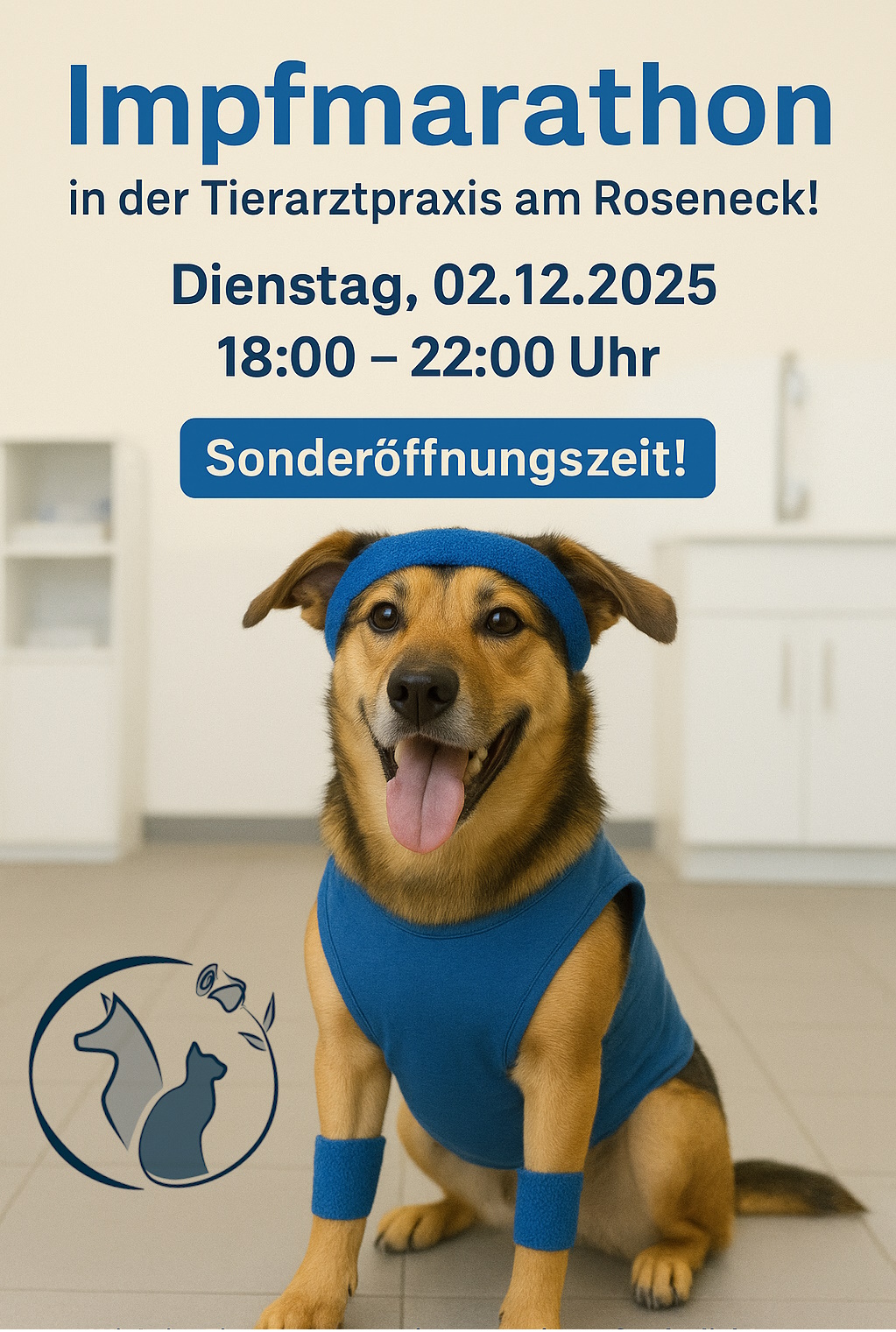 Über einen Besuch in unsere Tierarztpraxis am Roseneck würden wir uns freuen. Bitte bringen Sie gegebenenfalls Unterlagen wie z.B. Impfpass, Untersuchungsberichte, Medikamente etc. mit.
